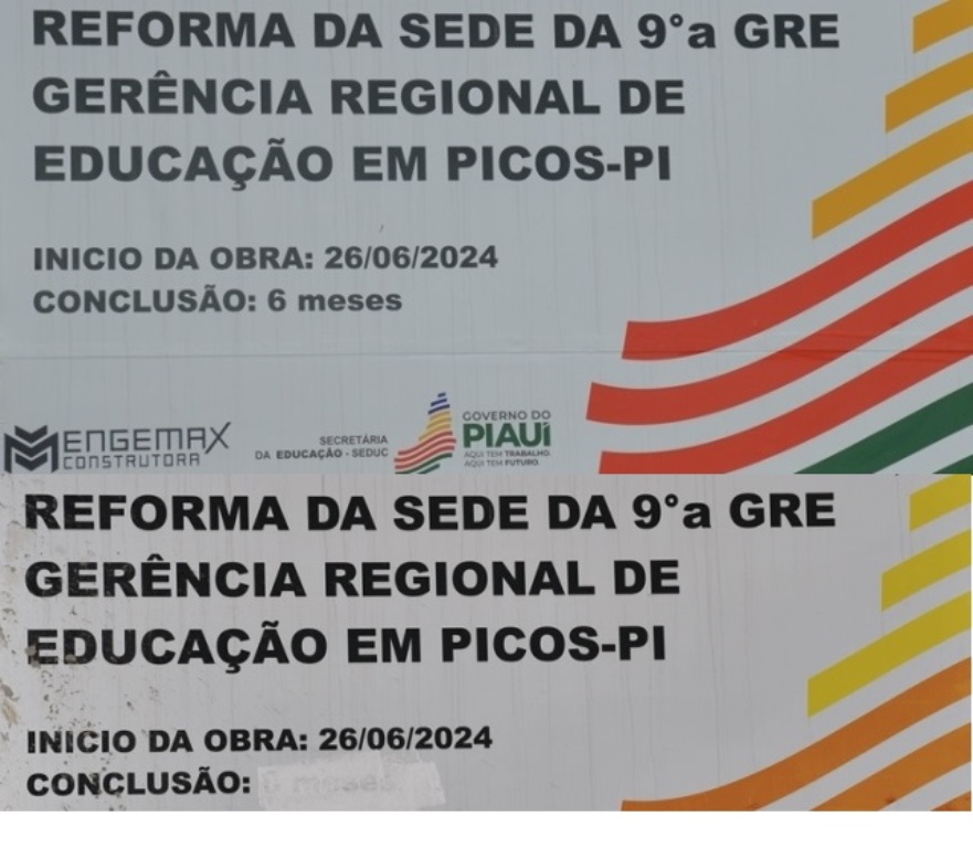 A empresa responsável pela reforma da sede da 9ª Gerência Regional de Educação, em Picos, apagou a data de conclusão da obra que constava na placa. Iniciado em 26 de junho do ano passado, o serviço deveria ser concluído em seis meses, ou seja, em 26 de dezembro de 2024. Com praticamente um ano de atraso, a solução encontrada foi apagar a data prevista no contrato para que ninguem fique sabendo.