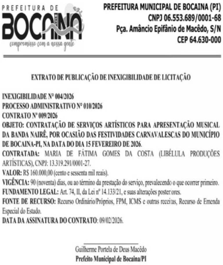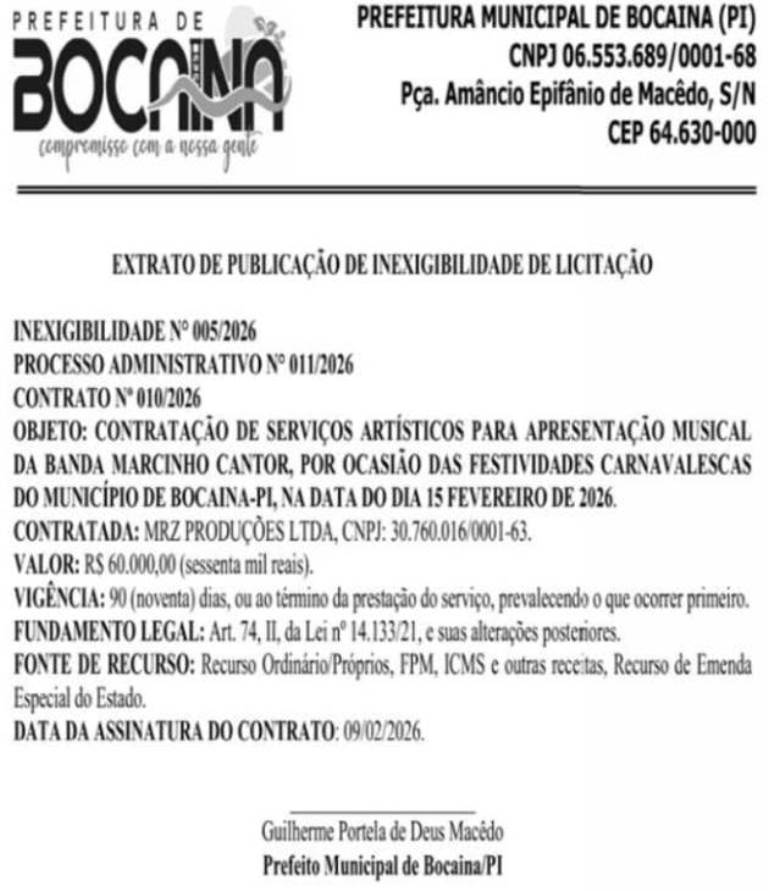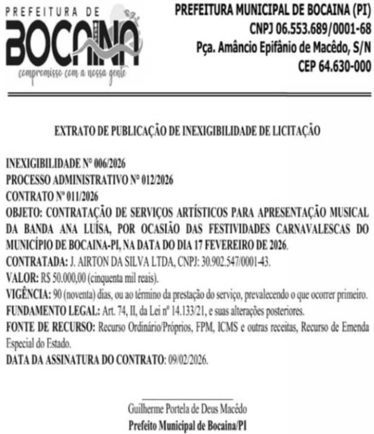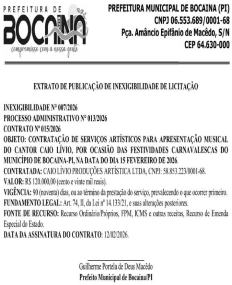 A festa carnavalesca será realizada no domingo, 15 de fevereiro, e na terça-feira, 17, na Barragem de Bocaina. Os contratos com as empresas que representam as bandas que animarão o evento foram assinados pelo prefeito Guilherme Macedo (PT) e, cópias dos extratos publicadas no Diário Oficial das Prefeituras Piauienses.