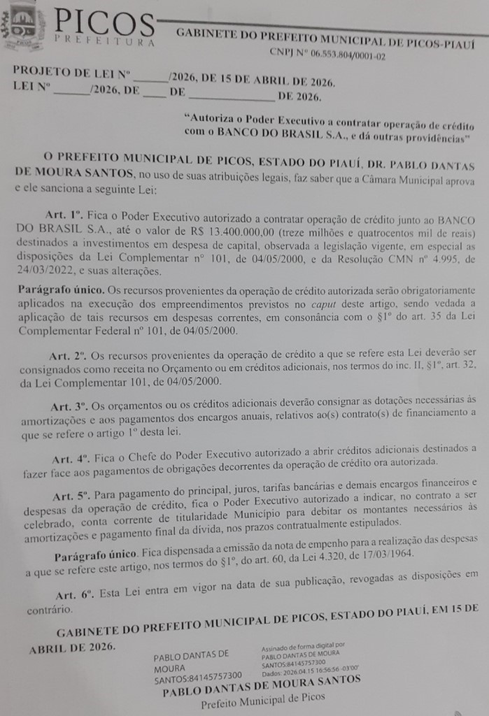 Os vereadores já haviam autorizado no dia 4 de dezembro do ano passado, o prefeito de Picos Pablo Santos (MDB) a contrair empréstimo de R$ 80 milhões. O projeto de lei foi sancionado pelo gestor e publicado no Diário Oficial dos Municípios.