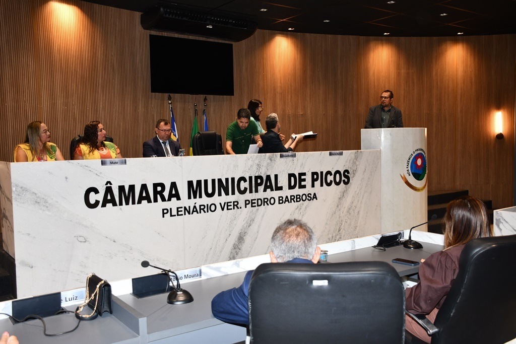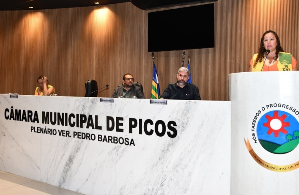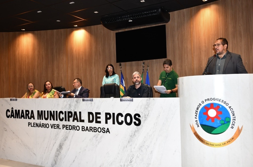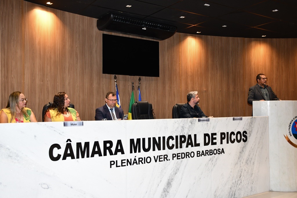 O presidente da Câmara Municipal de Picos, Rinaldinho (MDB), abriu a sessão solene e em seguida passou o comando dos trabalhos ao vereador Wellington Dantas (PT), autor da proposição.