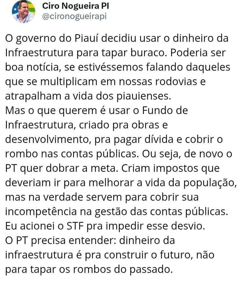 O senador Ciro Nogueira (PP) utilizou suas redes sociais na última quinta-feira (17) para criticar a decisão do governo do Piauí de utilizar recursos do Fundo de Infraestrutura para o pagamento de dívidas e cobertura de déficit nas contas públicas.