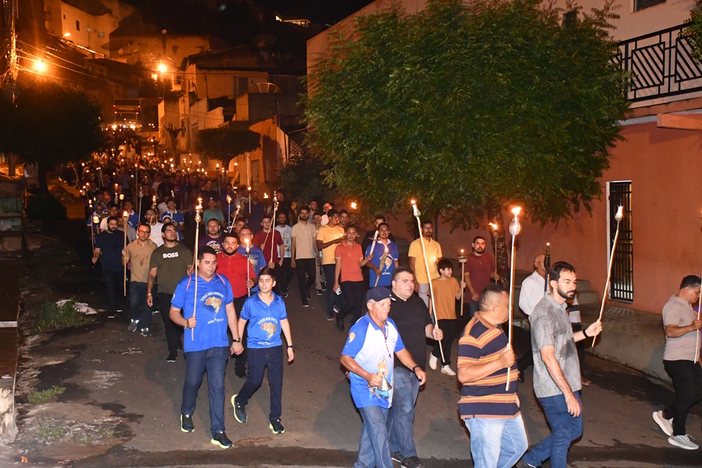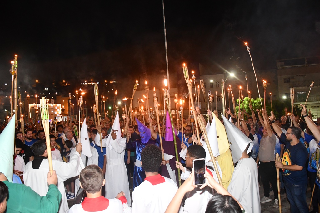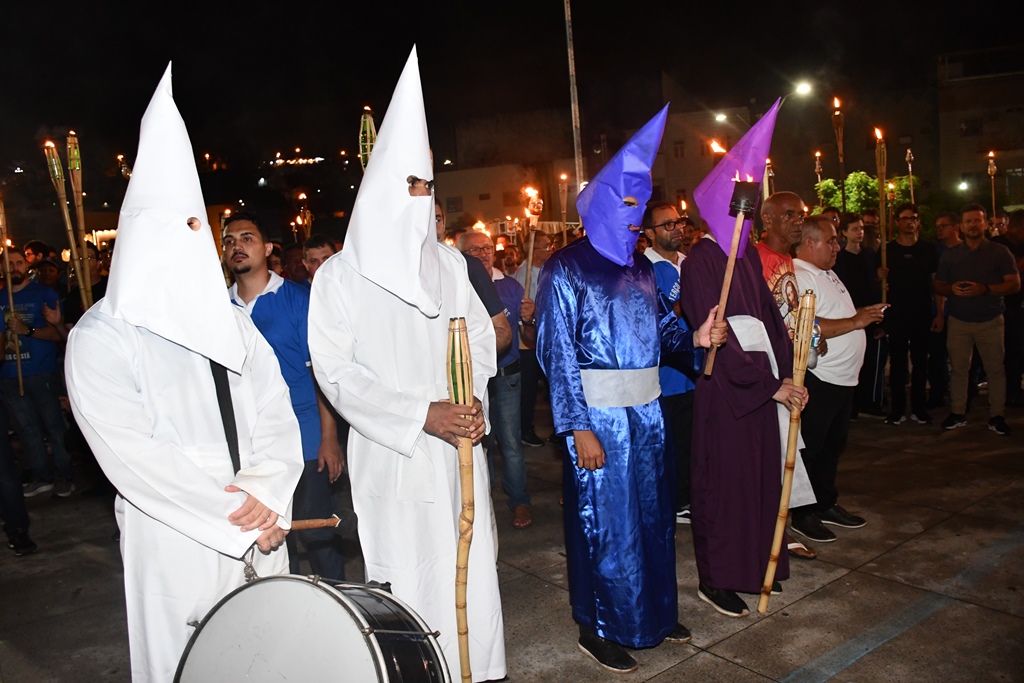 Os participantes da Procissão do Fogaréu carregam tochas de fogo, simbolizando a perseguição e a busca dos soldados romanos por Jesus Cristo no Jardim das Oliveiras.