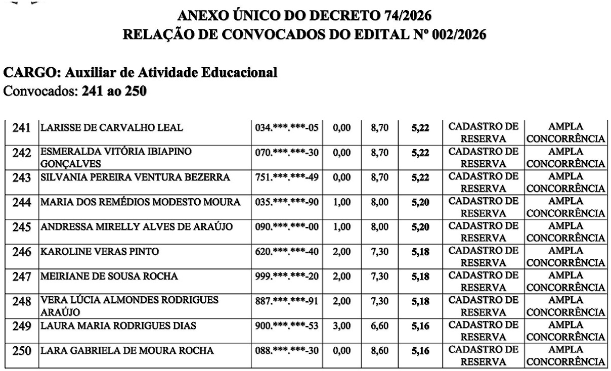 Em decreto assinado na última sexta-feira, 24 de abril, o prefeito de Picos Pablo Santos (MDB), convocou dez candidatos aprovados no teste seletivo para o cargo de auxiliar de atividade educacional.
