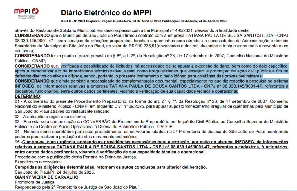 O principal objeto da apuração é um contrato firmado entre a Prefeitura de São João do Piauí e a empresa TATIANA PAULA DE SOUSA SANTOS LTDA, inscrita no CNPJ 08.030.145/0001-47, no valor de R$ 910.235,91, destinado à prestação de serviços de refeições preparadas, lanches e quentinhas para atender a administração municipal e demais secretarias.