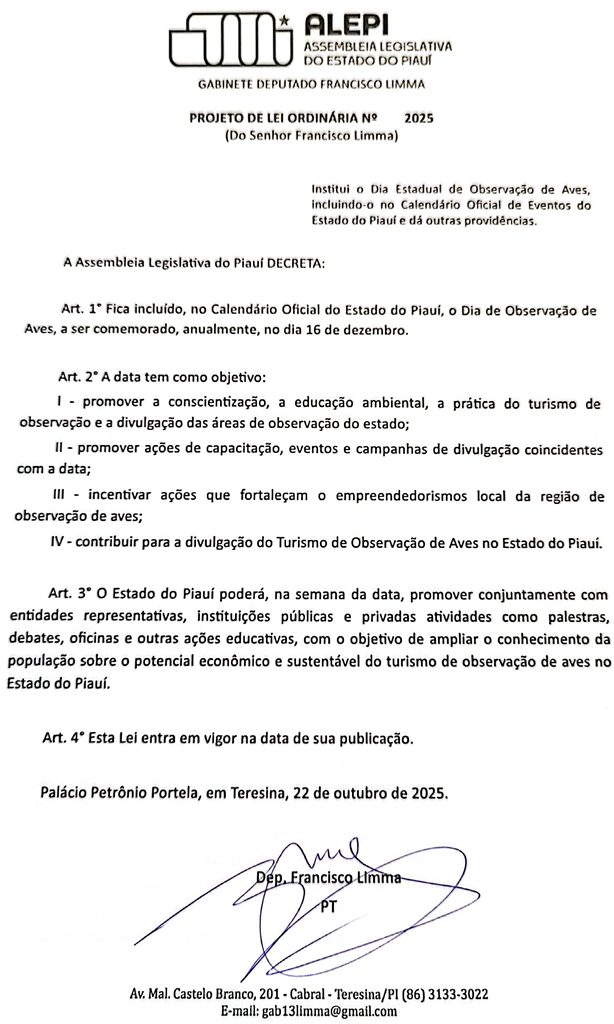 Tramita na Assembleia Legislativa do Piauí (Alepi) um projeto de lei que propõe a criação do Dia Estadual de Observação de Aves, a ser comemorado anualmente em 16 de dezembro.