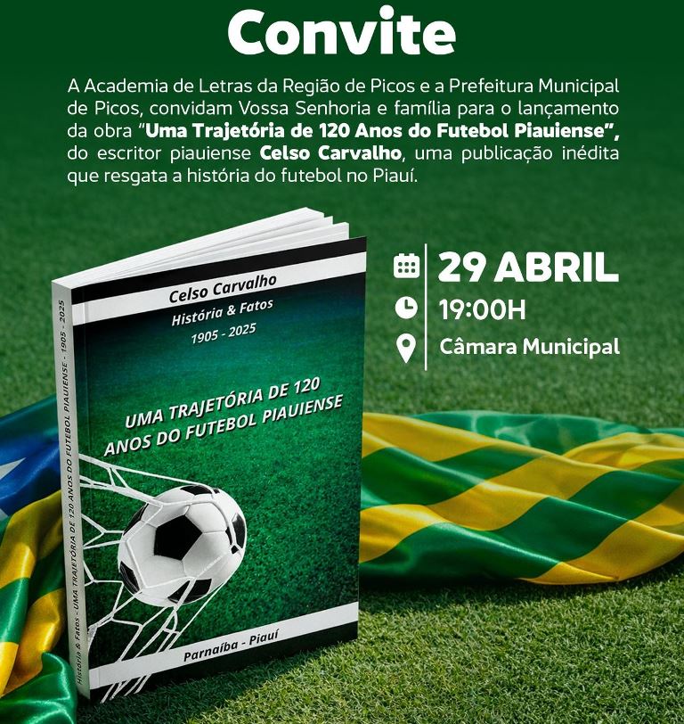 O escritor Celso Carvalho lançará em Picos na próxima quarta-feira, 29 de abril, o livro “Uma Trajetória de 120 anos do Futebol Piauiense”. A solenidade está prevista para as 19 horas no plenário da Câmara de Vereadores e, deverá contar com a presença de autoridades e desportistas.