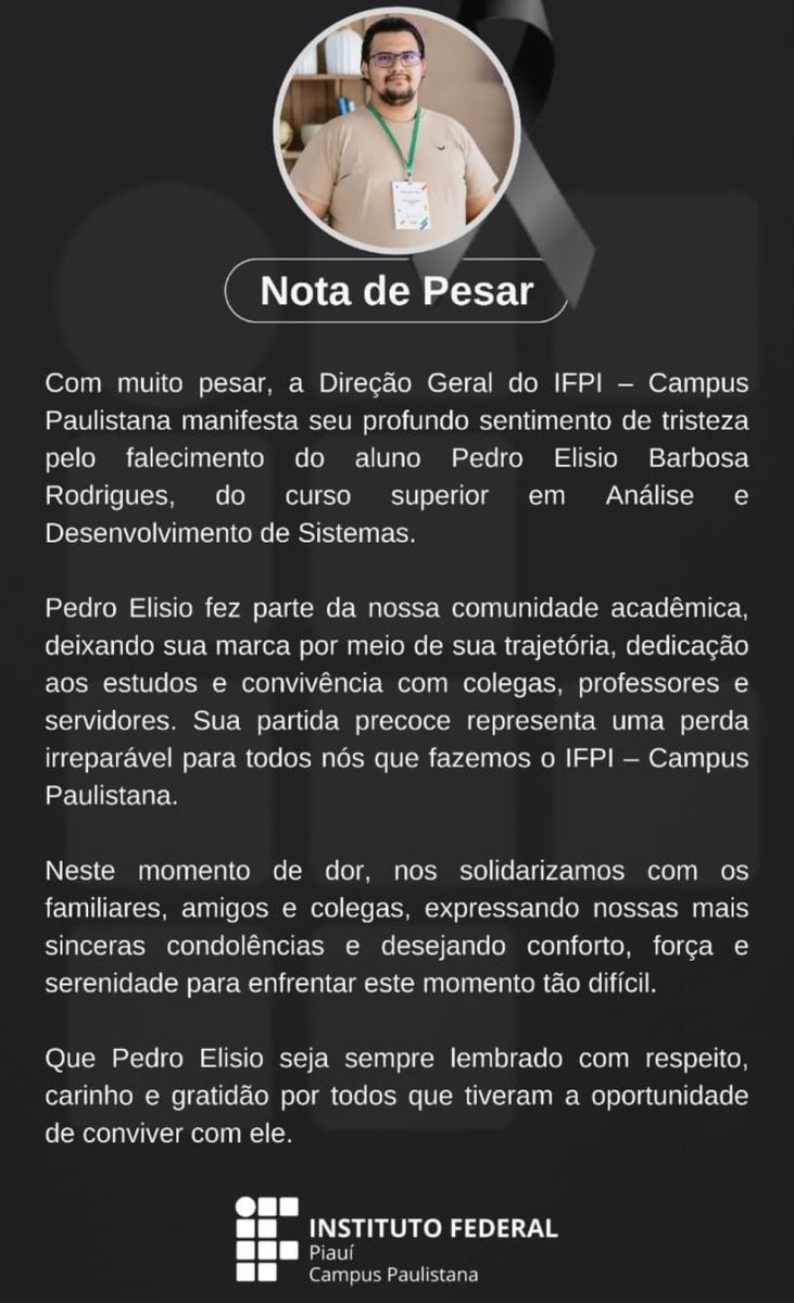 Pedro Elísio Barbosa Rodrigues, 25 anos, era aluno do curso superior em Análise e Desenvolvimento de Sistemas do IFPI, em Paulistana.