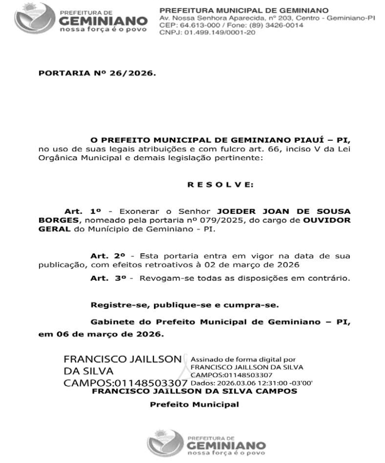 O ex-prefeito de Geminiano Jânio Jader de Sousa Borges foi nomeado no último dia 13 de março para exercer o cargo em comissão de Ouvidor Geral do Município.