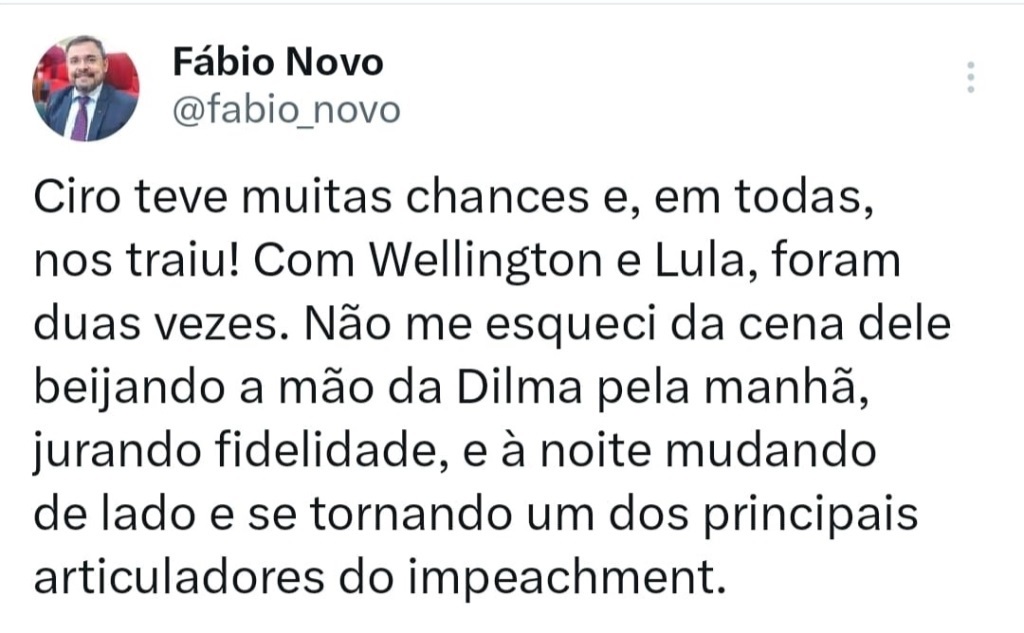 Na publicação, Fábio também relembrou a passagem de Ciro pelo governo Jair Bolsonaro e afirmou que, na avaliação do PT do Piauí, o senador teria atuado de forma contrária aos interesses do estado. O deputado mencionou ainda embates políticos relacionados à liberação de recursos para o Piauí, que, segundo ele, ocorreram em um contexto de decisões judiciais favoráveis ao ex governador, Wellington Dias.