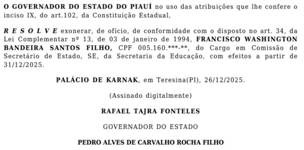 O governador do Piauí Rafael Fonteles (PT) exonerou, de ofício, nesta sexta-feira, 26 de dezembro, o secretário estadual de Educação, Washington Bandeira. Para o lugar dele foi nomeado Rodrigo Torres de Araújo Lima.