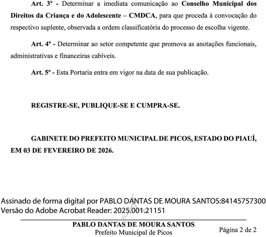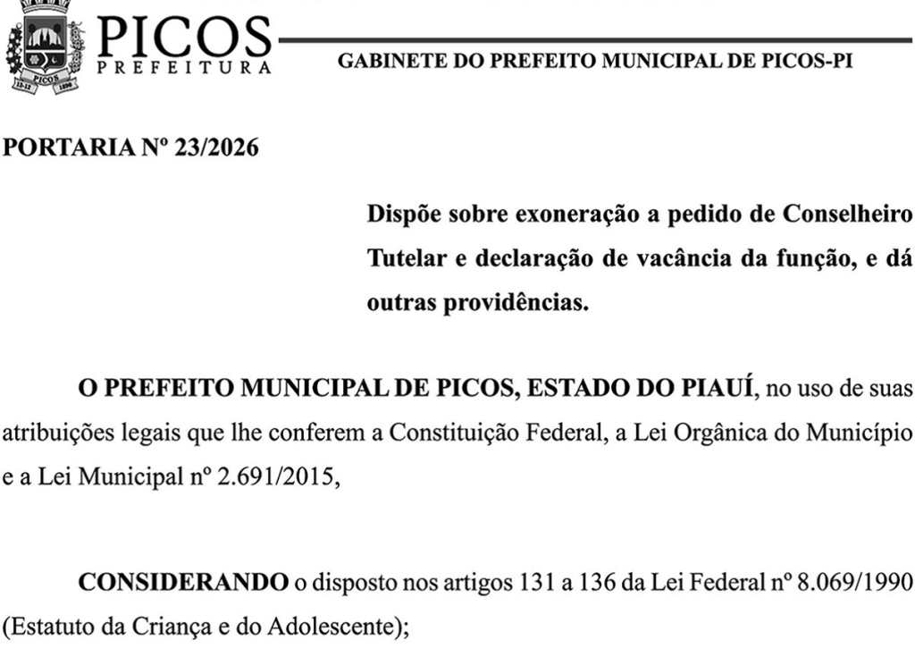 Na mesma portaria, o prefeito Pablo Santos declarou a vacância da função de conselheiro tutelar de Picos a partir da data do protocolo do pedido de renúncia de Josivaldo Ferreira Lavor de Lima.