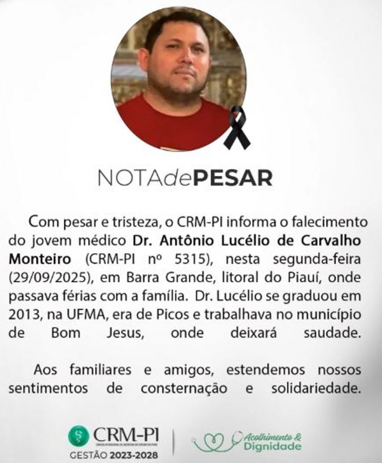 O Conselho Regional de Medicina do Piauí (CRM-PI) lamentou a morte do médico Antônio Lucélio de Carvalho Monteiro, de 41 anos, vítima de afogamento na praia de Barra Grande, litoral do estado. Natural de Picos, ele se formou em 2013 pela Universidade Federal do Maranhão (UFMA) e atuava em Bom Jesus.