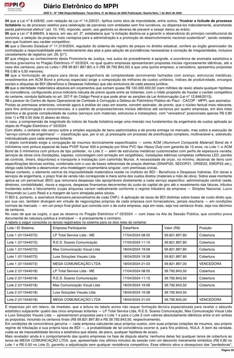De acordo com a 36ª Promotoria de Justiça de Teresina, quatro das cinco empresas apresentaram propostas com valores absolutamente idênticos, inclusive nos centavos, em dois lotes distintos. A única diferença foi um desconto mínimo aplicado pela empresa vencedora, a Mega Comunicação Ltda., de apenas R$ 0,80 em um lote e R$ 0,50 no outro.