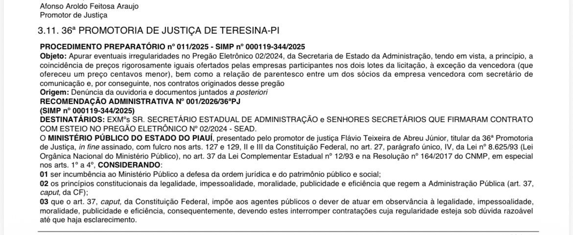 Diante do conjunto de indícios, o MPPI recomendou ao secretário estadual de Administração a suspensão imediata de qualquer pagamento, execução contratual e novas adesões à ata de registro de preços. Também orientou que órgãos estaduais interrompam contratos derivados do pregão até a conclusão de auditoria pelo Tribunal de Contas do Estado.