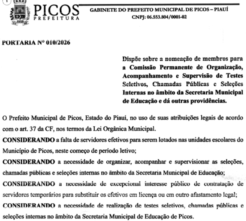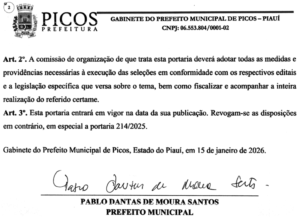 A portaria de nomeação foi assinada no último dia 15 de janeiro pelo prefeito de Picos, Pablo Santos