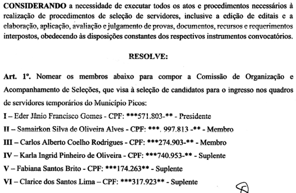 O prefeito de Picos Pablo Santos (MDB) nomeou no último dia 15 de janeiro os seis membros que vão compor a comissão de organização e acompanhamento de seleções, que visa à seleção de candidatos para o ingresso nos quadros de servidores temporários do município.