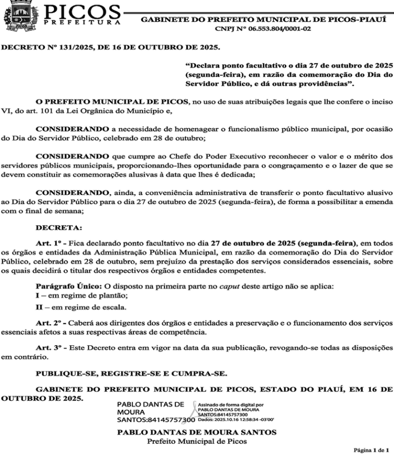 O prefeito de Picos Pablo Santos (MDB) decidiu antecipar o ponto facultativo alusivo ao Dia do Servidor Público, comemorado em 28 de outubro – próxima terça-feira.