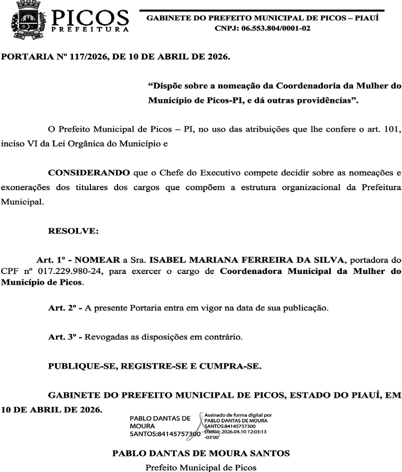 Em portaria assinada no último dia 10 de abril, o prefeito de Picos Pablo Santos (MDB) nomeou Isabel Mariana Ferreira da Silva para exercer o cargo em comissão de Coordenadora Municipal da Mulher.
