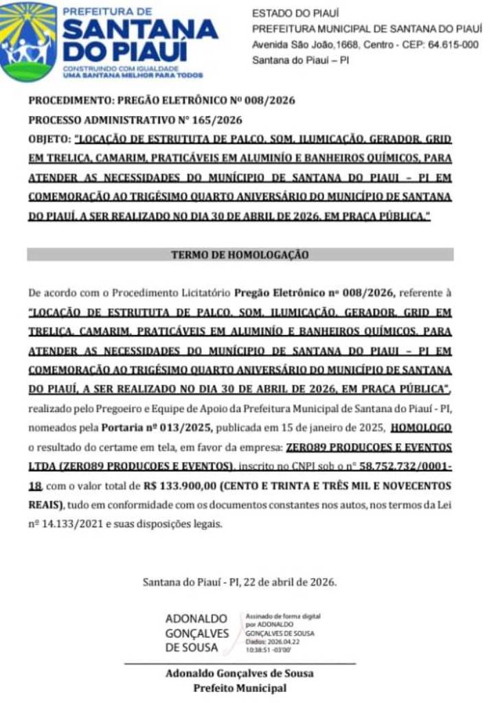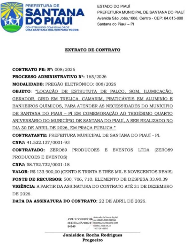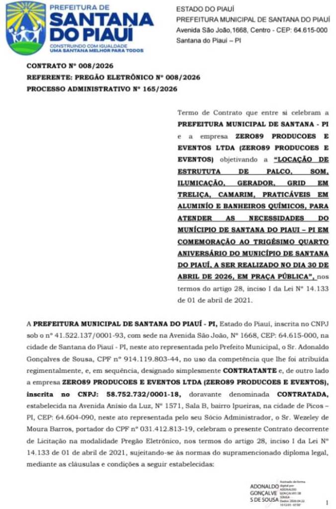 O prefeito de Santana do Piauí Adonaldo Gonçalves de Sousa, mais conhecido como Adonaldo Cassiano, assinou contrato no valor de R$ 133.900,00 com a empresa Zero89 Produções e Eventos Ltda, situada à Avenida Anísio da Luz, 1571, Sala B, bairro Ipueiras, em Picos.