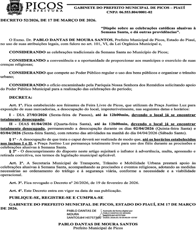 Em decreto assinado no último dia 17 de março, o prefeito de Picos Pablo Santos (MDB) determinou o horário de funcionamento da feira-livre durante o período da Semana Santa.