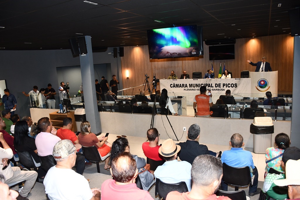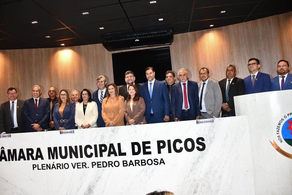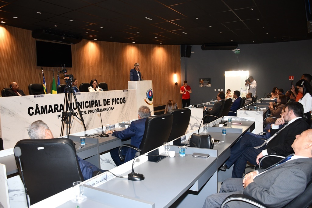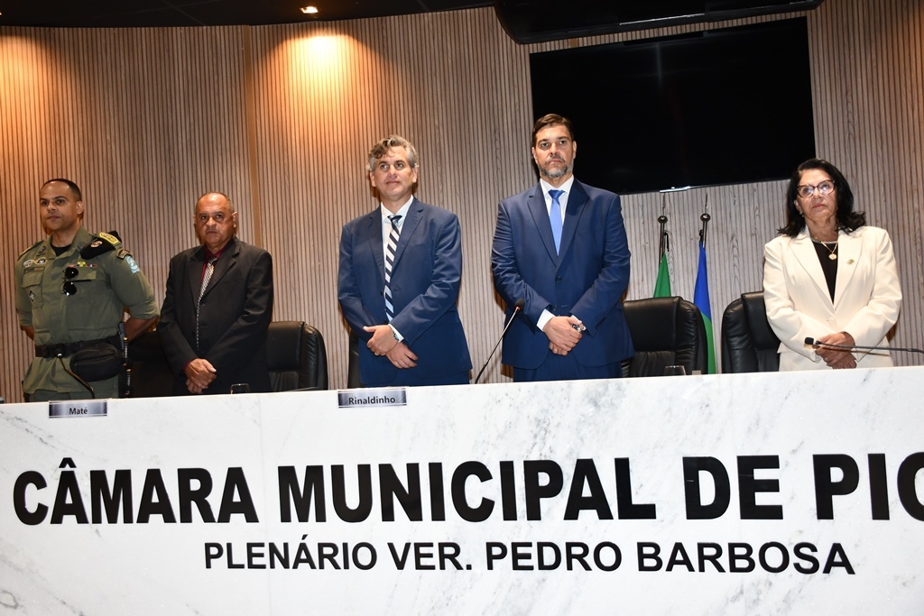 A sessão solene de abertura do ano legislativo foi conduzida pelo presidente da Câmara Municipal de Picos, Rinaldinho (MDB) e contou com a presença de 16 vereadores. Ausente apenas Eriberto Barros (PSD). Prestigiaram o evento secretários municipais, servidores públicos e populares que lotaram as galerias.