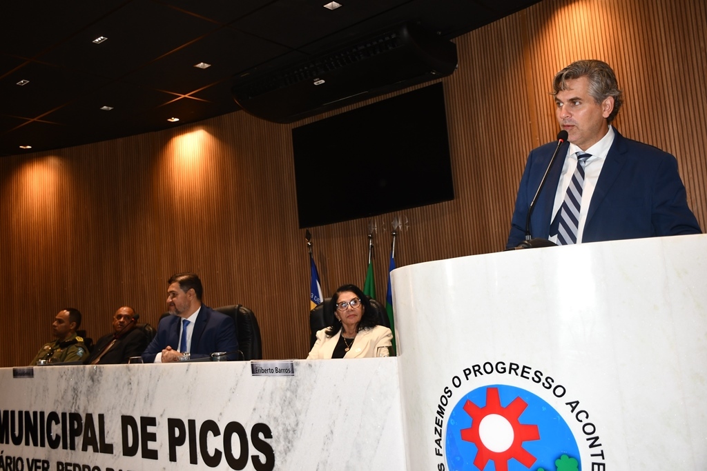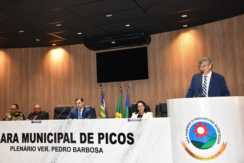 Durante a mensagem, o prefeito Pablo Santos destacou a harmonia entre os poderes e agradeceu o apoio de parceiros federais e estaduais na captação de recursos para obras essenciais em Picos.