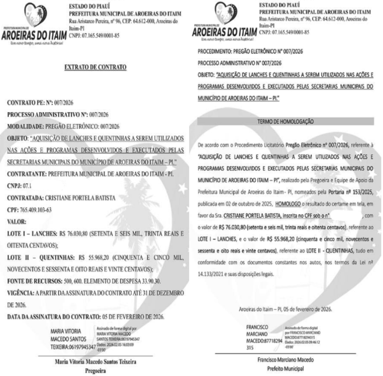O termo de homologação do contrato foi assinado pelo prefeito de Aroeiras do Itaim, Francisco Marciano Macedo (PSD).