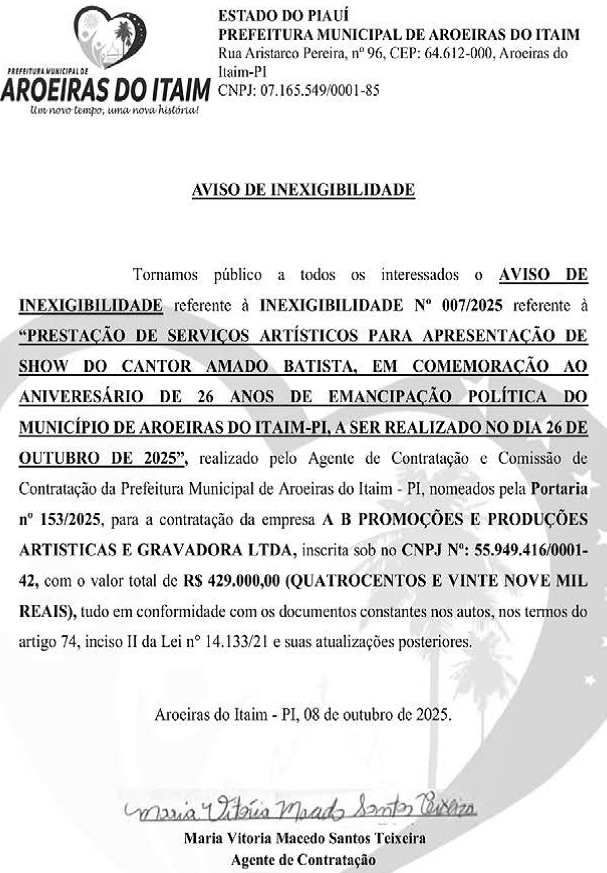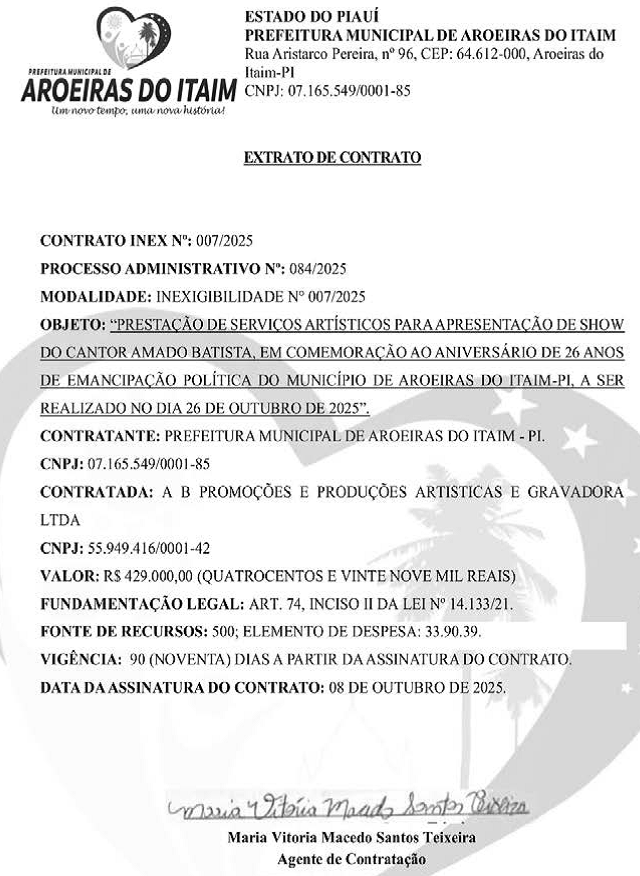 O objeto do contrato é a prestação de serviços artísticos para apresentação de show do cantor amado Batista, em comemoração ao aniversário de 26 anos de emancipação política do município de Aroeiras do Itaim, a ser realizado no próximo dia 26 de outubro.