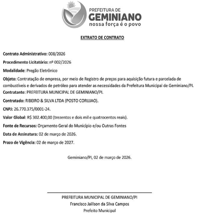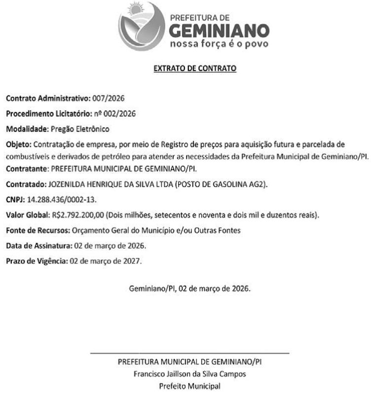 Os contratos com as duas empresas fornecedoras dos produtos foram assinados no último dia 2 de março pelo prefeito de Geminiano, Francisco Jailson da Silva Campos (PSD).