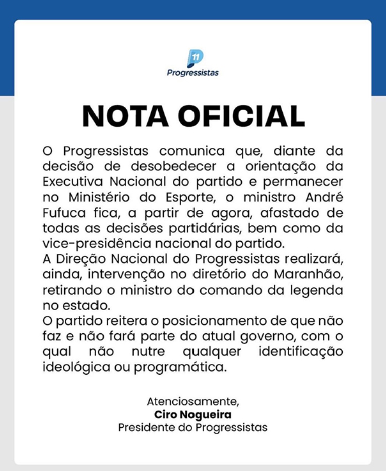 O Progressistas afastou nesta quarta-feira (8) o ministro do Esporte, André Fufuca, do partido. A decisão foi tomada em razão da permanência dele na pasta e no Governo Lula. A sigla ainda anunciou que ele deixa a vice-presidência nacional e perderá o comando do partido no Maranhão.