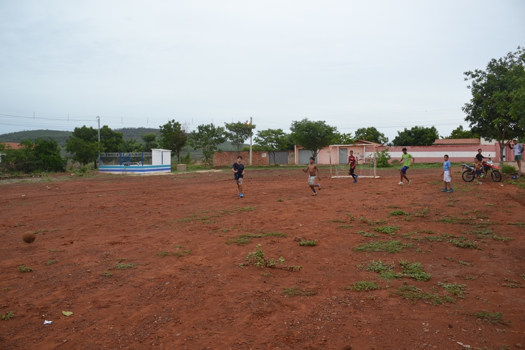 Como a quadra de esportes desabou, crianças do bairro Morada Nova improvisaram um campinho de futebol na terra, ao lado do complexo interditado, enquanto aguardam a recuperação do antigo espaço.