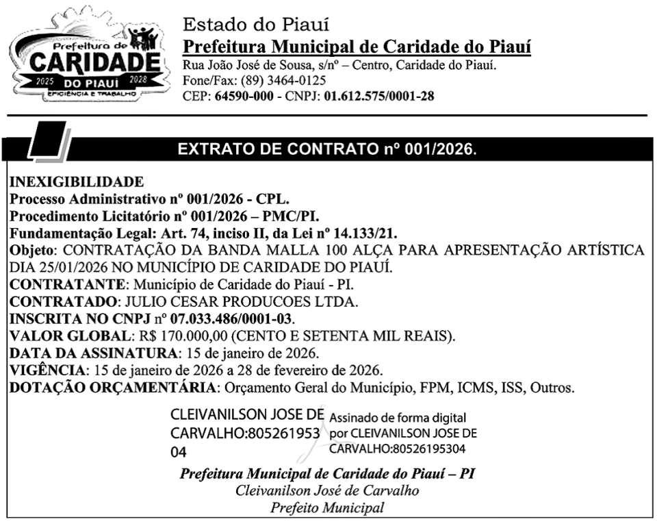 O contrato para apresentação artísticas foi assinado no último dia 15 de janeiro entre o prefeito de Caridade do Piau, Cleivanilson José de Carvalho, o Clei Carvalho (PSD) e Júlio César Produções Ltda, representante da banda Mala 100 Alça.