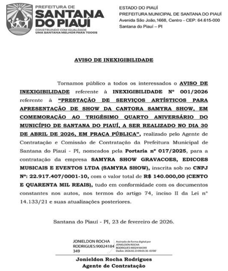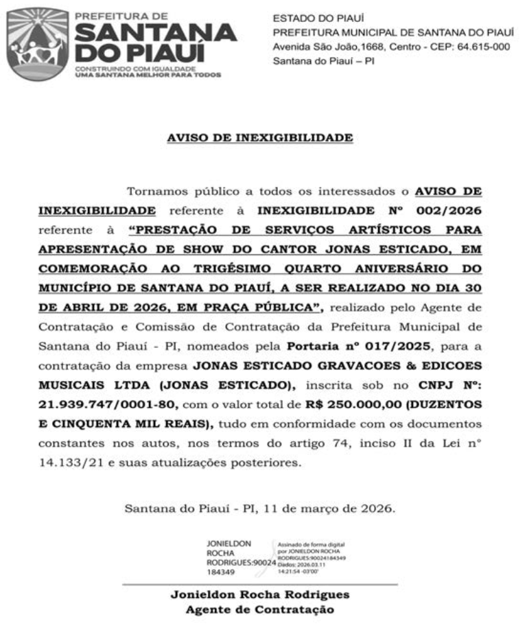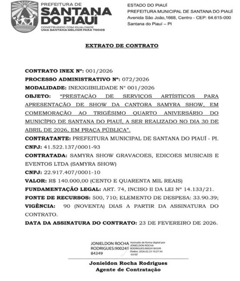 O contrato com a empresa que representa Jonas Esticado foi assinado no último dia 11 de março e, cópia do extrato publicada no Diário Oficial das Prefeituras Piauienses em 13 do mesmo mês, página 47.