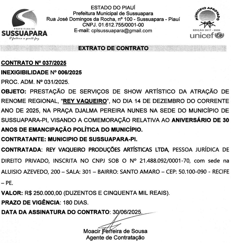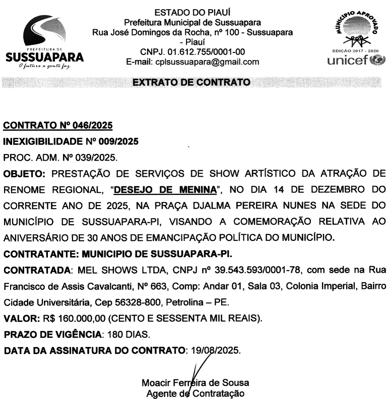 Mesmo com o município em situação de emergência por causa da seca, a Prefeitura de Sussuapara vai gastar R$ 410 mil com os shows de Rey Vaqueiro e da banda Desejo de Menina. Os dois contratos foram celebrados através da inexigibilidade de licitação.