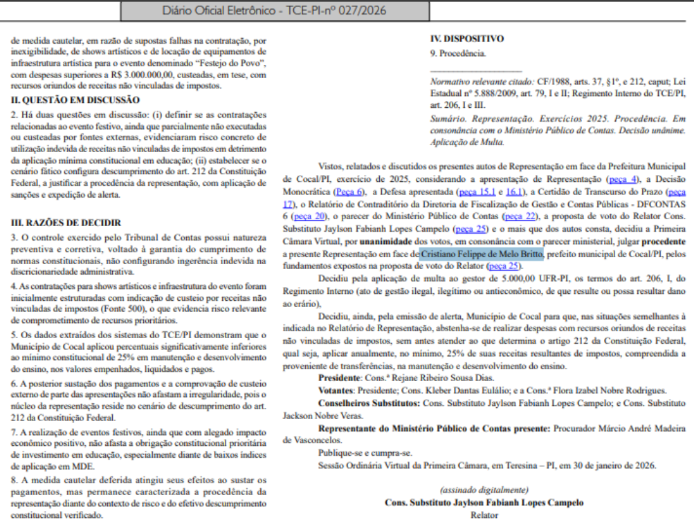 O Tribunal de Contas do Estado do Piauí julgou procedente uma representação contra a Prefeitura de Cocal por irregularidades na contratação de shows artísticos e estrutura para o evento “Festejo do Povo”, com despesas superiores a R$ 3 milhões. A decisão foi unânime na Primeira Câmara Virtual e resultou na aplicação de multa ao prefeito Cristiano Felippe de Melo Britto.