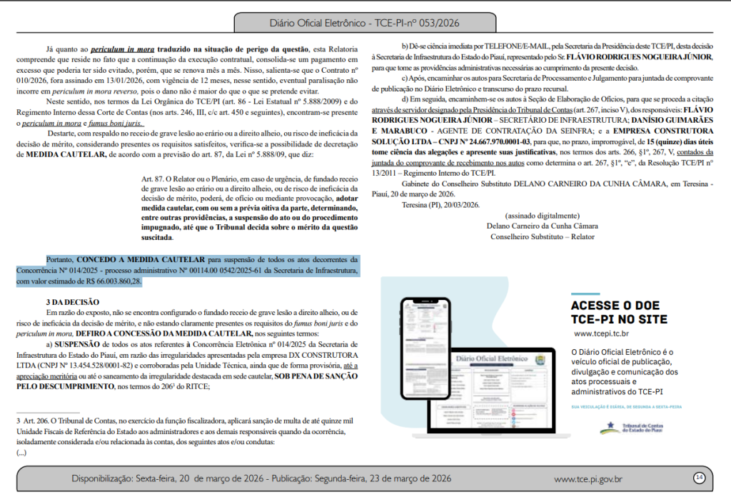 O Tribunal de Contas do Estado do Piauí determinou a suspensão imediata de todos os atos relacionados à Concorrência nº 014/2025 da Secretaria Estadual de Infraestrutura, estimada em R$ 66 milhões. A decisão atende a denúncia apresentada por empresa participante do certame e aponta indícios de irregularidades que podem ter causado prejuízo milionário aos cofres públicos.