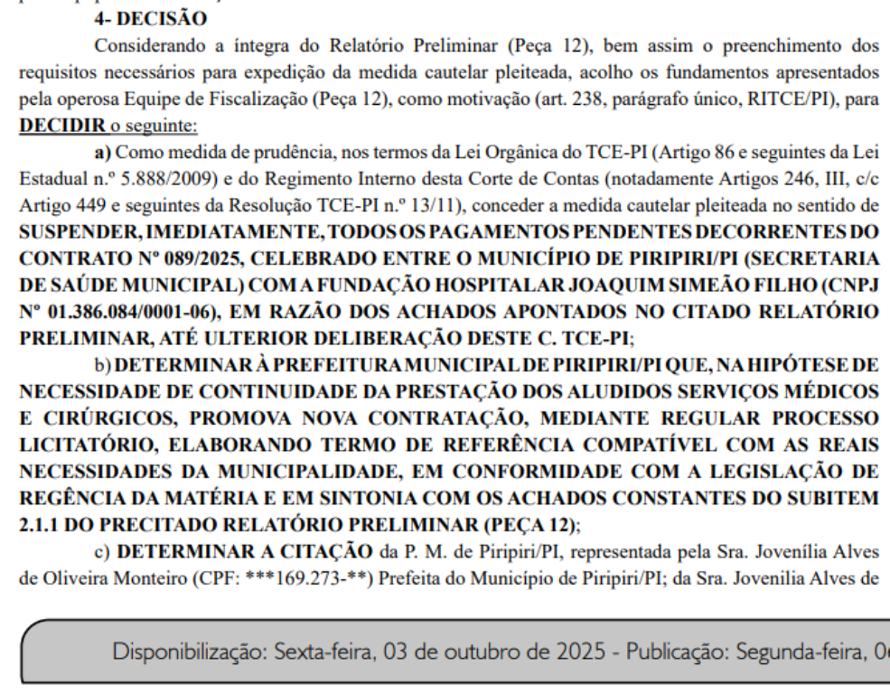 O Tribunal de Contas do Estado do Piauí (TCE-PI) determinou a suspensão imediata dos pagamentos referentes ao Contrato nº 089/2025, firmado entre a Prefeitura Municipal de Piripiri, administrada pela prefeita Jôve oliveira, e a Fundação Hospitalar Joaquim Simeão Filho, no valor de R$ 1,77 milhão. O contrato tinha como objeto a realização de cirurgias de catarata e o tratamento de esclerose múltipla, incluindo consultas e acompanhamento pós-operatório.