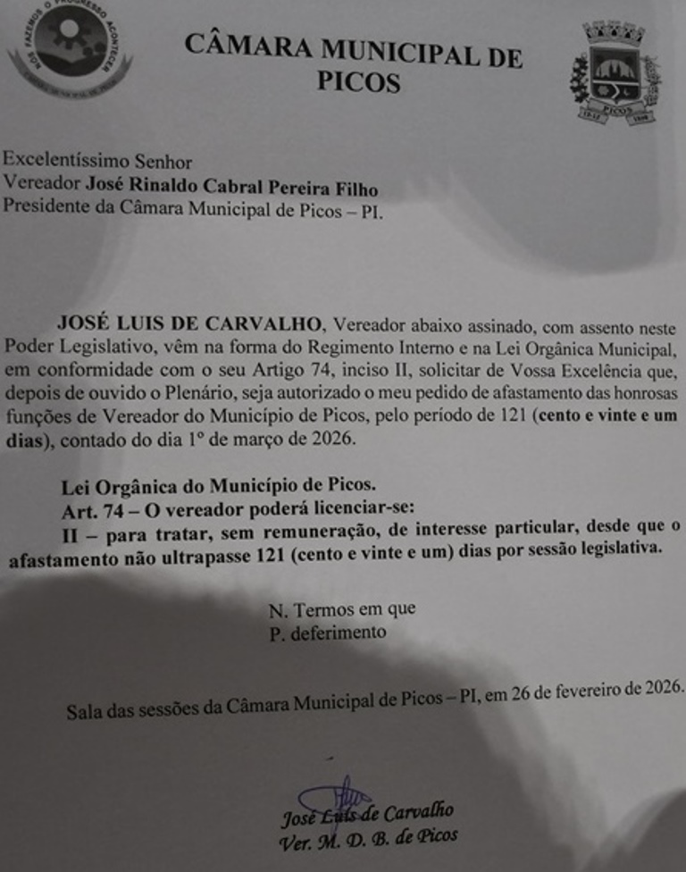 O pedido de licença do vereador José Luís de Carvalho foi aprovado pelo plenário da Câmara de Picos na sessão do dia 26 de fevereiro.