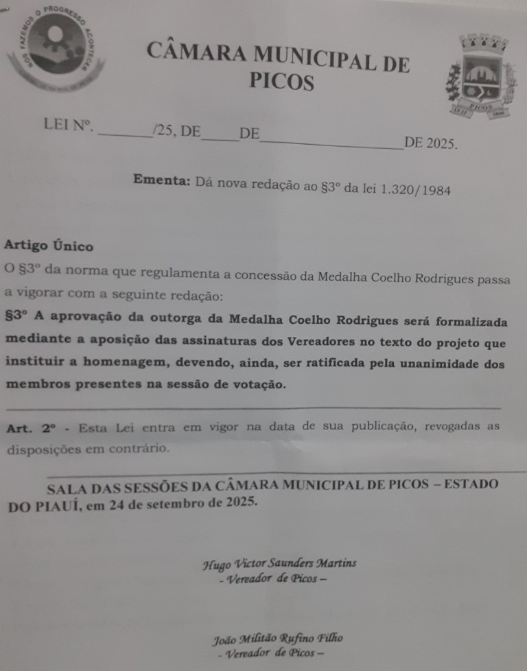 Quando a lei foi criada em 1984, a redação do §3º ainda em vigor é bem clara: “A Medalha de Honra ao Mérito Coelho Rodrigues apenas será concedida, por aprovação de todos os vereadores componentes do Poder Legislativo Picoense”.